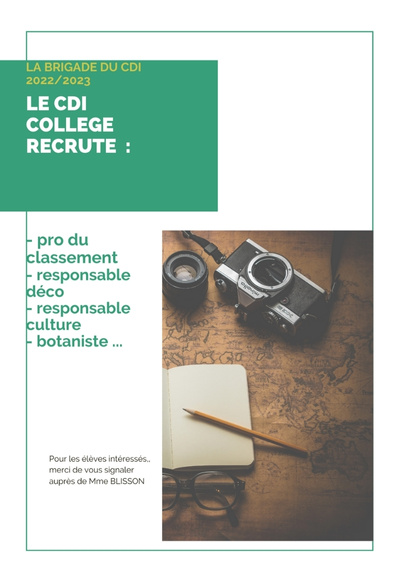 Ont pu ainsi voir le jour en 2021/2022 les postes de «pro du rangement», «Pro du classement», «chef décorateur», «responsable animation», «responsable d’exposition», «botaniste » (avec mise en place d’un CDI «vert») «responsable informatique» (avec mise en place de 2 tablettes destinées à la consultation des élèves et commencement d’attribution de codes barres aux fictions du CDI).