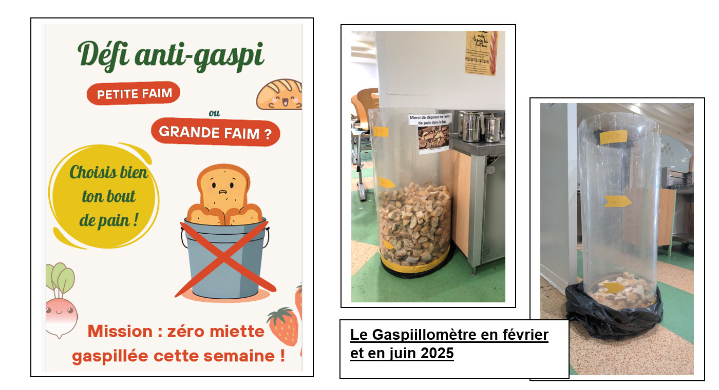 - Lors de la semaine du développement durable et la semaine du 2 juin un gaspillomètre à pain a été placé dans le réfectoire du collège pour mesurer la quantité de pain gaspillé et la quantifier en euros. On a pu constater un effort des collégiens pour jeter moins de pain. Ce projet sera reconduit l’année prochaine.
